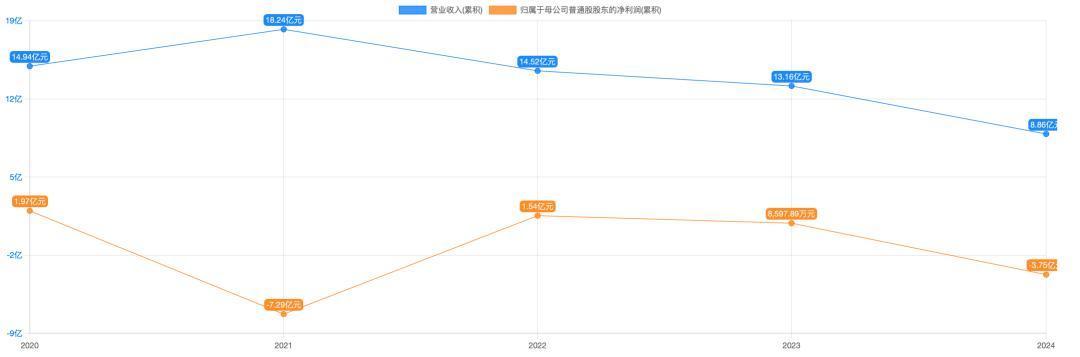 2024年,公司全年营业收入为8.86亿元,同比大幅下降32.68%,跌至2017年水平;归母净利润为-3.75亿元,同比暴跌535.88%。