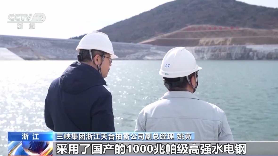 三峡集团浙江天台抽蓄公司副总经理 姚亮:为了承受超高水头的巨大压力,我们在引水系统的核心部位,采用了国产的1000兆帕级高强水电钢,承压能力是大概在每平方厘米,也就是一个指甲盖大小的面积上可以承受10吨的压力,这是在水电工程的首次大规模应用。