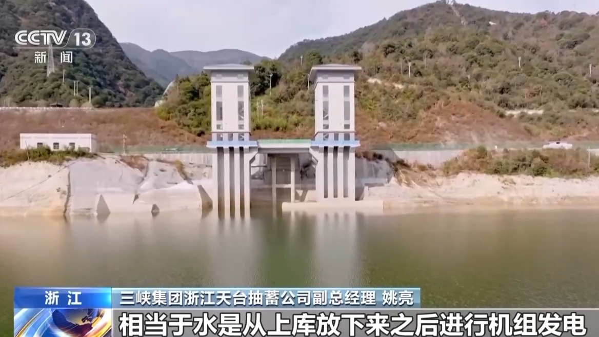 三峡集团浙江天台抽蓄公司副总经理 姚亮:可以看到那边是进出水口,在机组发电的时候它是出水口,抽水的时候是进水口,相当于水是从上库放下来之后进行机组发电,在下库里存起来。