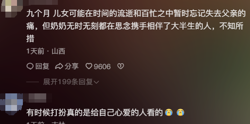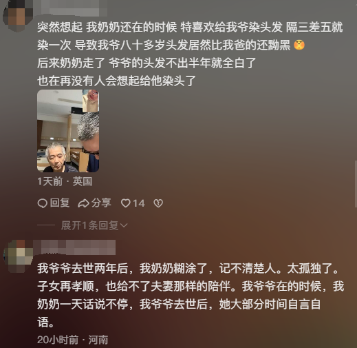 高女士发布视频后,很多网友都在评论区分享自己的故事,“突然想起,我奶奶还在的时候,特喜欢给我爷染头发,隔三差五就染一次,导致我爷八十多岁头发居然比我爸的还黝黑,后来奶奶走了,爷爷的头发不出半年就全白了,也在再没有人会想起给他染头了”,“我爷爷去世两年后,我奶奶糊涂了,记不清楚人。太孤独了。子女再孝顺,也给不了夫妻那样的陪伴。我爷爷在的时候,我奶奶一天话说不停,我爷爷去世后,她大部分时间自言自语”……
