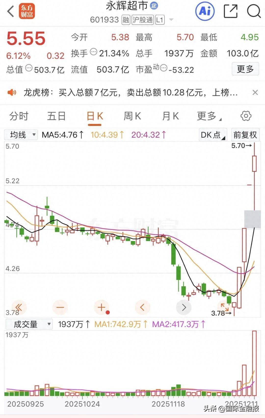 12月11日,永辉超市(601933)股价以5.55元收盘,较上个交易日上涨6.12%恒瑞易配,延续过去三天连续涨停的狂欢。